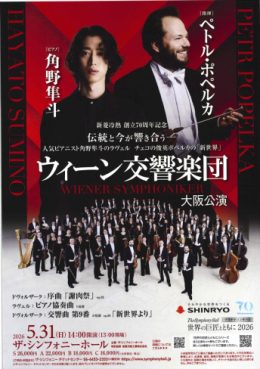 Concertコンサート ウィーン交響楽団 大阪公演 [開催日]2026.05.31(日) 開催日2026.05.31(日) 開 演Open 13:00 / Start 14:00 団 体指揮:ペトル・ポペルカ ピアノ:角野隼斗 管弦楽:ウィーン交響楽団 会 場ザ・シンフォニーホール チケットS席:26,000円 A席:22,000円 B席:18,000円 C席:16,000円