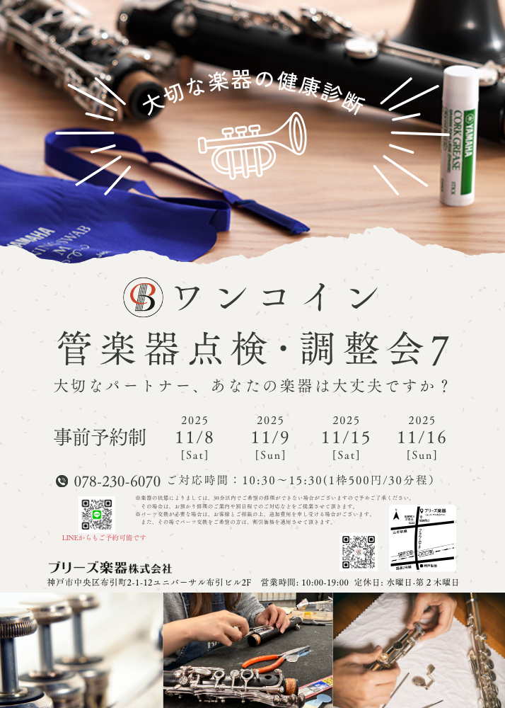 さて、ブリーズ楽器では毎回ご好評をいただいております「ワンコイン管楽器点検・調整会.7」を開催する運びとなりましたのでご案内申し上げます。
