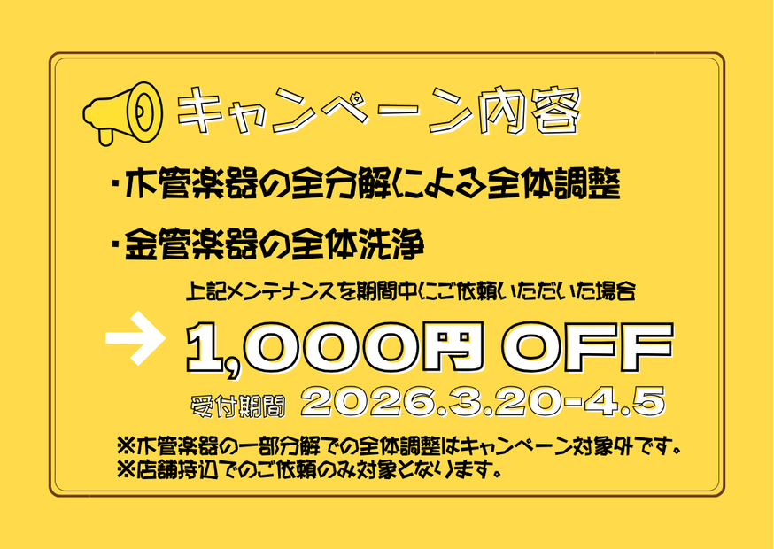 上記内容のメンテナンスを期間中にご依頼いただいた場合、通常料金から一律1,000円引きを適用させて頂きます。(楽器は店舗持込でのご依頼が対象となります)